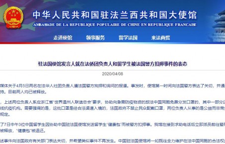 中国驻法国大使馆就在法侨团负责人和留学生被法国警方扣押事件表态