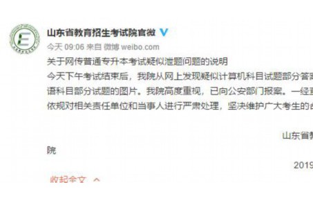 山东省考试院回应“专升本考试疑似泄题”:已报案
