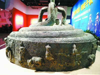 图为被追回的文物战国“蟠蛇纹建鼓座”