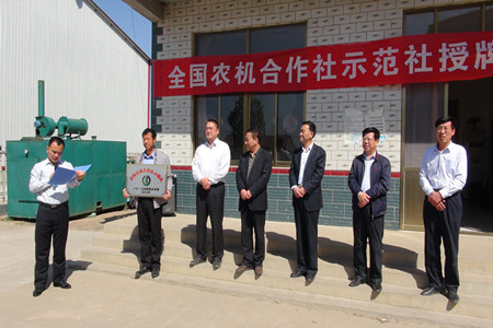 随后,市农机局马兴伦局长一行到景国农机服务专业合作社进行了“全国农机合作社示范社”授牌仪式。2016年,无棣县景国农机服务专业合作社被农业部授予“全国农机合作社示范社”,该合作社自成立以来,创新社会服务模式,积极参与农机社会化服务,大力推进农作物秸秆综合利用和土地流转、土地托管的适度规模经营,大力实施市重点项目棉杆压块生物质能源项目,通过棉杆压块代替煤炭,实现了秸秆的综合利用,也实现了经济效益和生态效益的双赢。