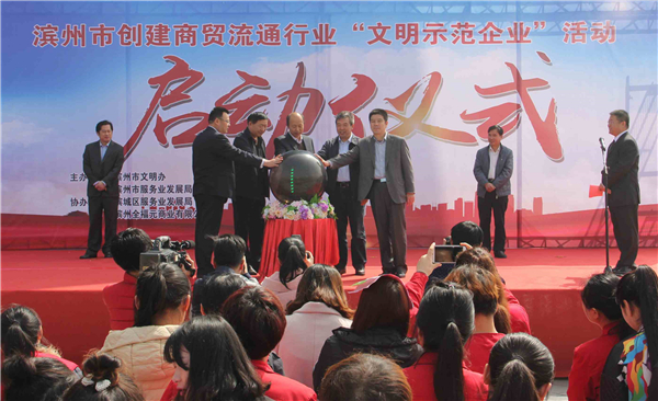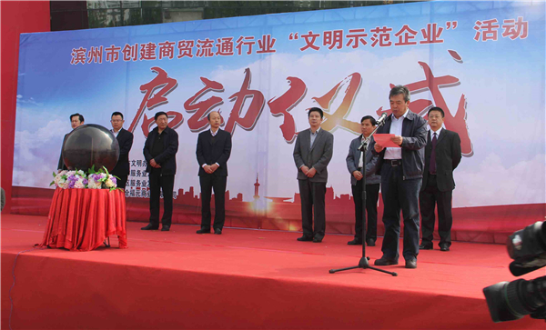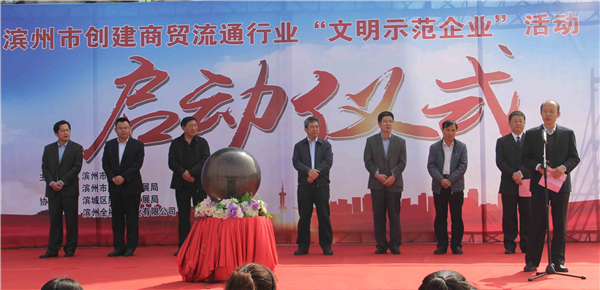 活动中,市服务业发展局党组副书记、副局长张宝东同志宣读了《关于开展创建商贸流通行业“文明示范企业”活动的通知》,滨州全福元商业有限公司总经理王增华作为全市商贸流通行业企业代表做了表态发言,市文明办副主任张忠强同志做了工作要求和部署。最后,与会领导们共同按动七彩球,标志着全市商贸流通行业“文明示范企业”创建活动正式启动。
