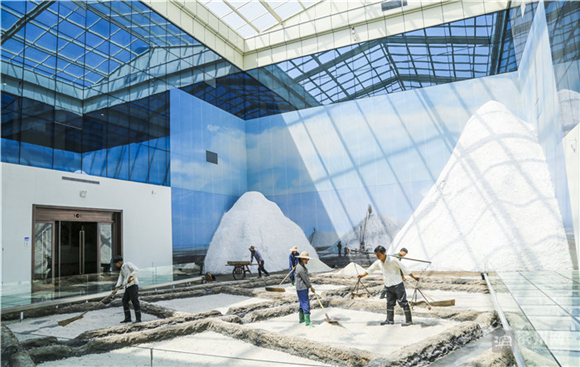 市民在深蓝色的光影领略先祖“煮海为盐”的历史文明。
