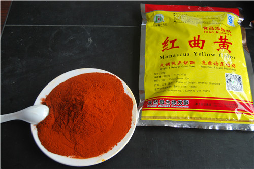 原料:以大米粉、豆浆为原料,利用现代的生物技术深层发酵后,通过黄化处理,经树脂吸附洗脱或纳滤浓缩处理后喷雾干燥而成的天然着色剂。