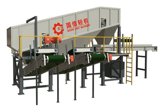 经破碎后的造纸废渣在斜置的平筛上摇滚跳动过程中,大片及条状轻质塑料(大料)被浮于上部并被收集,送入圆筒筛洗涤清洁;通过筛孔的纸片、纤维板、木片、麻绳等(纤维料)落入下部输送装置,进入搓揉机机械搓揉成浆。