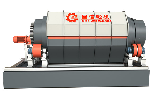 孔筛状圆筒筛,安装在带有滚轮的矩形槽体上滚动旋转,筒体内设计有清洗水管。