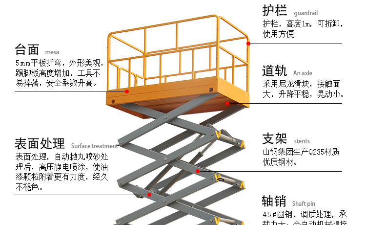 移动式升降平台产品优势:采用高强度锰钢结构,四轮移动方便、工作台面宽大,承载能力高,可多人同时作业,使高空作业更安全、效率更高。