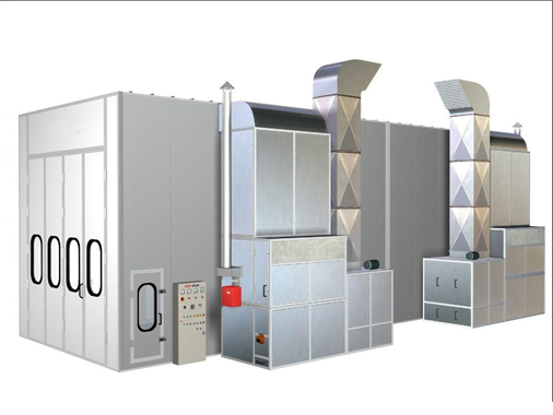 烤漆时,将风门调至烤漆位置,热风循环,烤房内温度迅速升高到预定干燥温度(55℃—60℃)。风机将外部新鲜空气进行初过滤后,与热能转换器发生热交换后送至烤漆房顶部的气室,再经过第二次过滤净化,热风经过风门的内循环作用,除吸进少量新鲜空气外,绝大部分热空气又被继续加热利用,使得烤漆房内温度逐步升高。当温度达到设定的温度时,燃烧器自动停止;当温度下降到设置温度时,风机和燃烧器又自动开启,使烤漆房内温度保持相对恒定。最后当烤漆时间达到设定的时间时,烤漆房自动关机,烤漆结束。