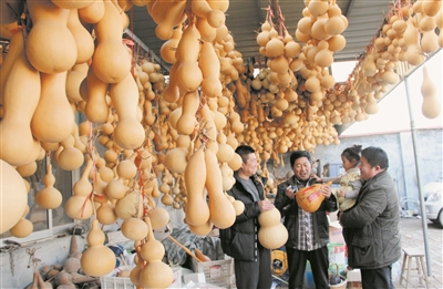 近年来,他也从以前的单纯创作葫芦画,发展为集营销葫芦画、葫芦籽、素葫芦、葫芦包装等为一体的链条模式,产品从几角钱的素葫芦到几千元的精品葫芦画应有尽有,其收入从原来的万元涨到了现在的每年三四十万元。