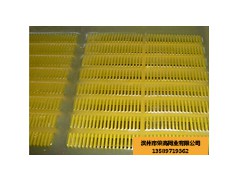 3、适用范围广,专业适用性更强,适用任何型号的振动筛机并可量机制作。聚氨酯筛网专业应用于水电站、建材及其它金属选矿业。0.1mm—170mm范围内各种物料的筛分,无论干筛、湿筛都毫不影响筛分效率。对0.5m—3mm范围内的脱水、脱介筛、更加充分地显示了聚氨酯筛面的优越性。产品耐水、耐腐蚀、耐老化,更换维护方便。聚氨酯密度小( 1.32kg/ m 3 ),重量轻于金属筛面,能降低生产单耗,因此能适应筛机大型化发展要求。