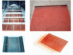 该筛片包括筛棒和梁架,数个筛棒等距排列并且一端均固定在梁架上,筛棒包括棒芯、棒套和铆头,棒芯一端固定在梁架上;棒套整体呈一圆台形结构,并且分为数个相应的变径段,变径段依次套设于棒芯的另一端上;铆头设于棒芯顶端,并与棒套一端相抵固定。通过圆台形的棒套使得筛棒之间的间隙构成一个锥形形状的网孔,从而避免了临界颗粒堵塞筛网;通过设置弹性胶垫圈来吸收棒芯在随机振动时出现的扰度或扰力,防止棒套受损,并增加了筛棒的弹性幅度,从而产生二次振动,更加有利于临界颗粒的筛分;另外,棒套采用了陶瓷材料,能够有效避免酸碱物料的腐蚀,延长其使用寿命。
